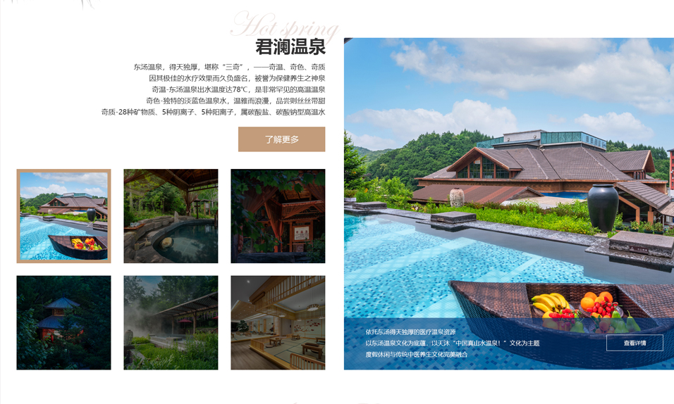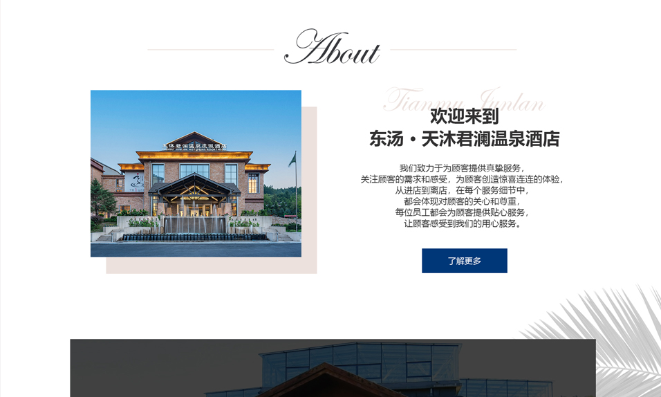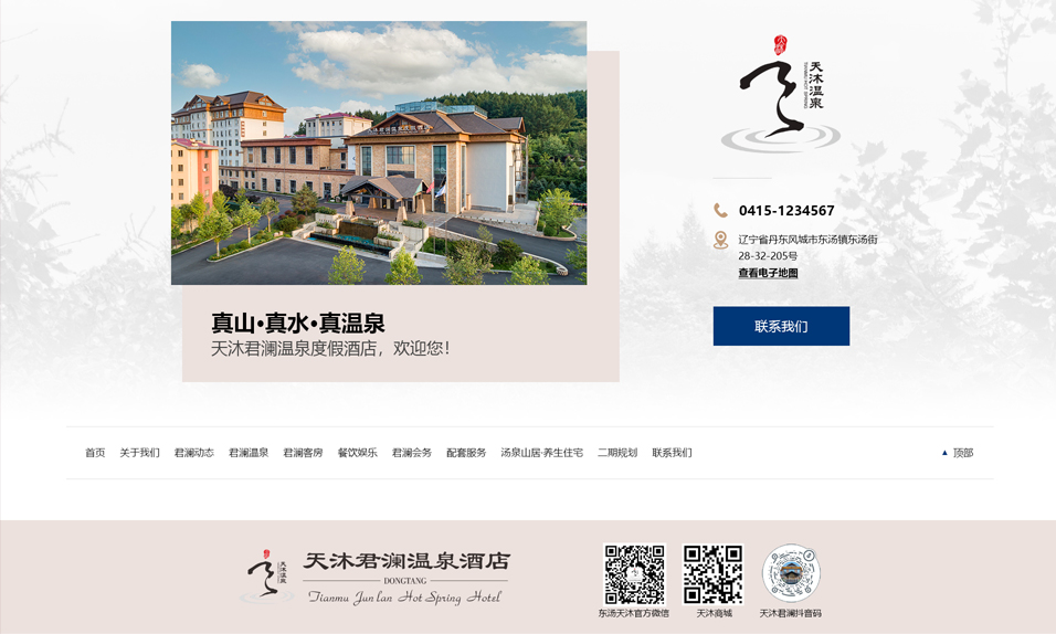 東湯天沐君瀾溫泉度假酒店位于遼寧省千年溫泉文化名城——東湯鎮(zhèn),是丹東市寶達房地產(chǎn)開發(fā)有限公司投資興建的一家集溫泉養(yǎng)生、酒店住宿、特色餐飲、休閑娛樂、商務會議于一體的綜合型溫泉度假酒店??傉嫉孛娣e 5 萬平米,周邊青山環(huán)繞、鳥語花香,環(huán)境極為愜意、自然。